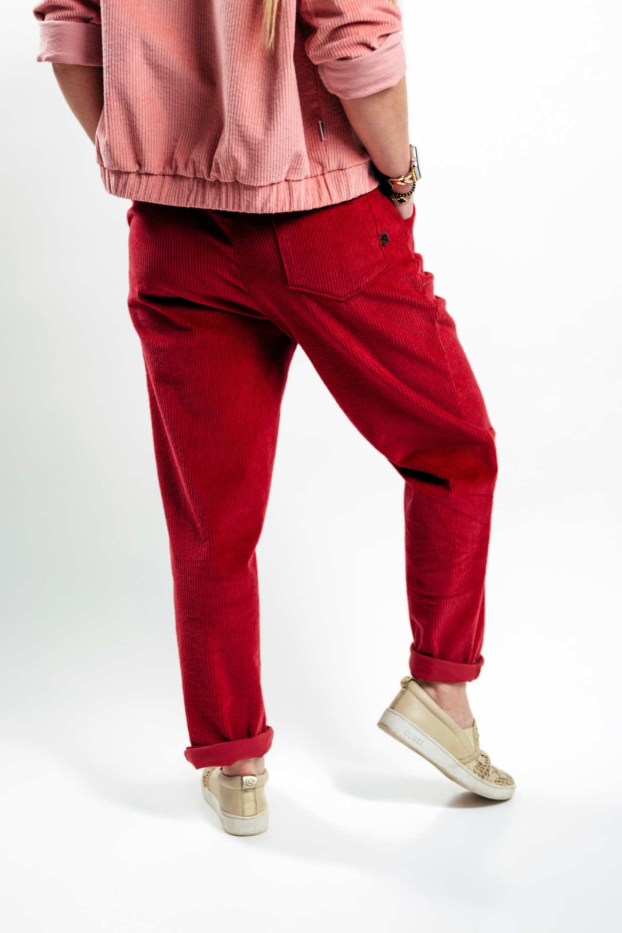 Zadní kapsa v jednom provedení. Užší nohavice lze nosit rovně nebo